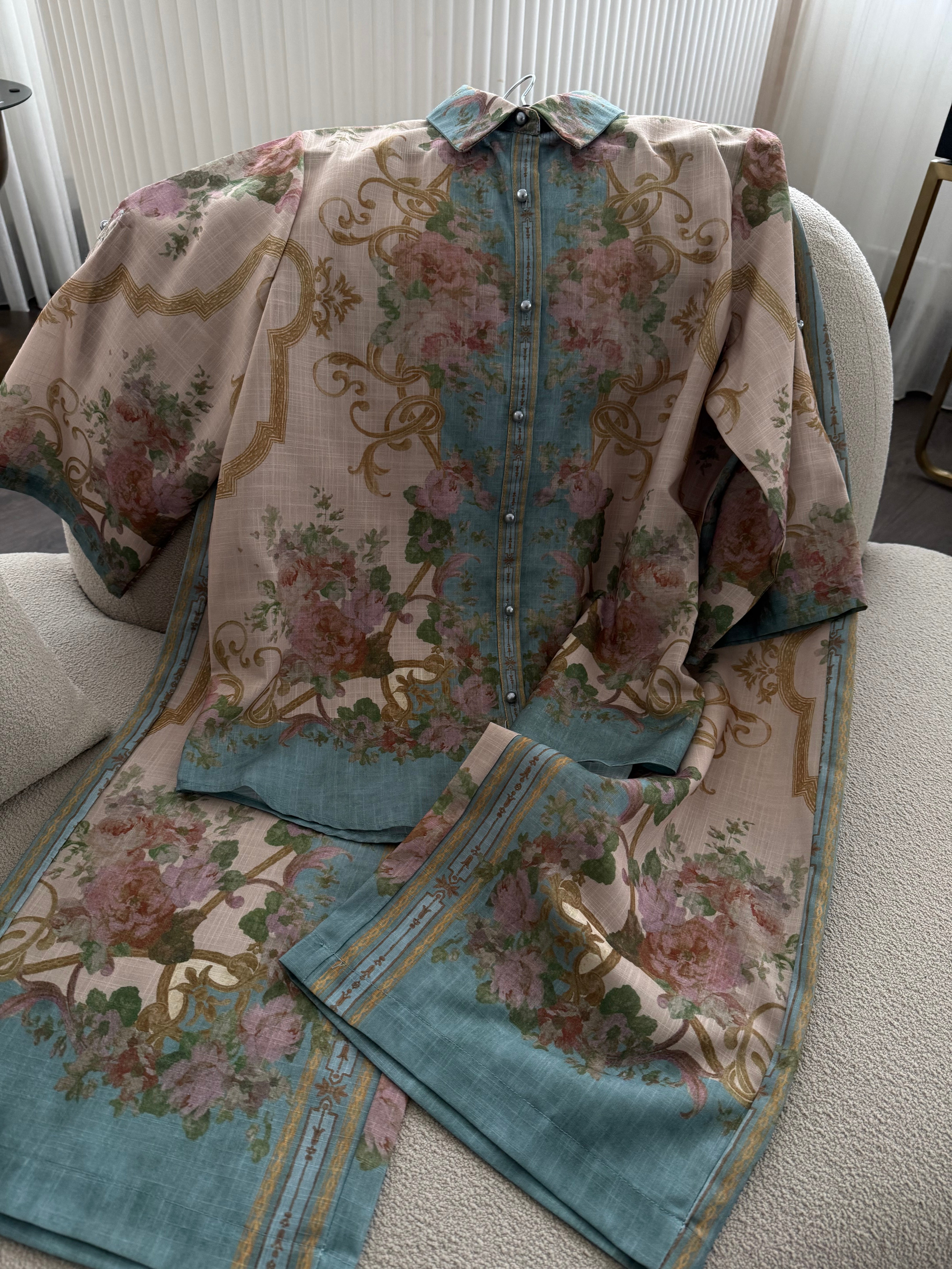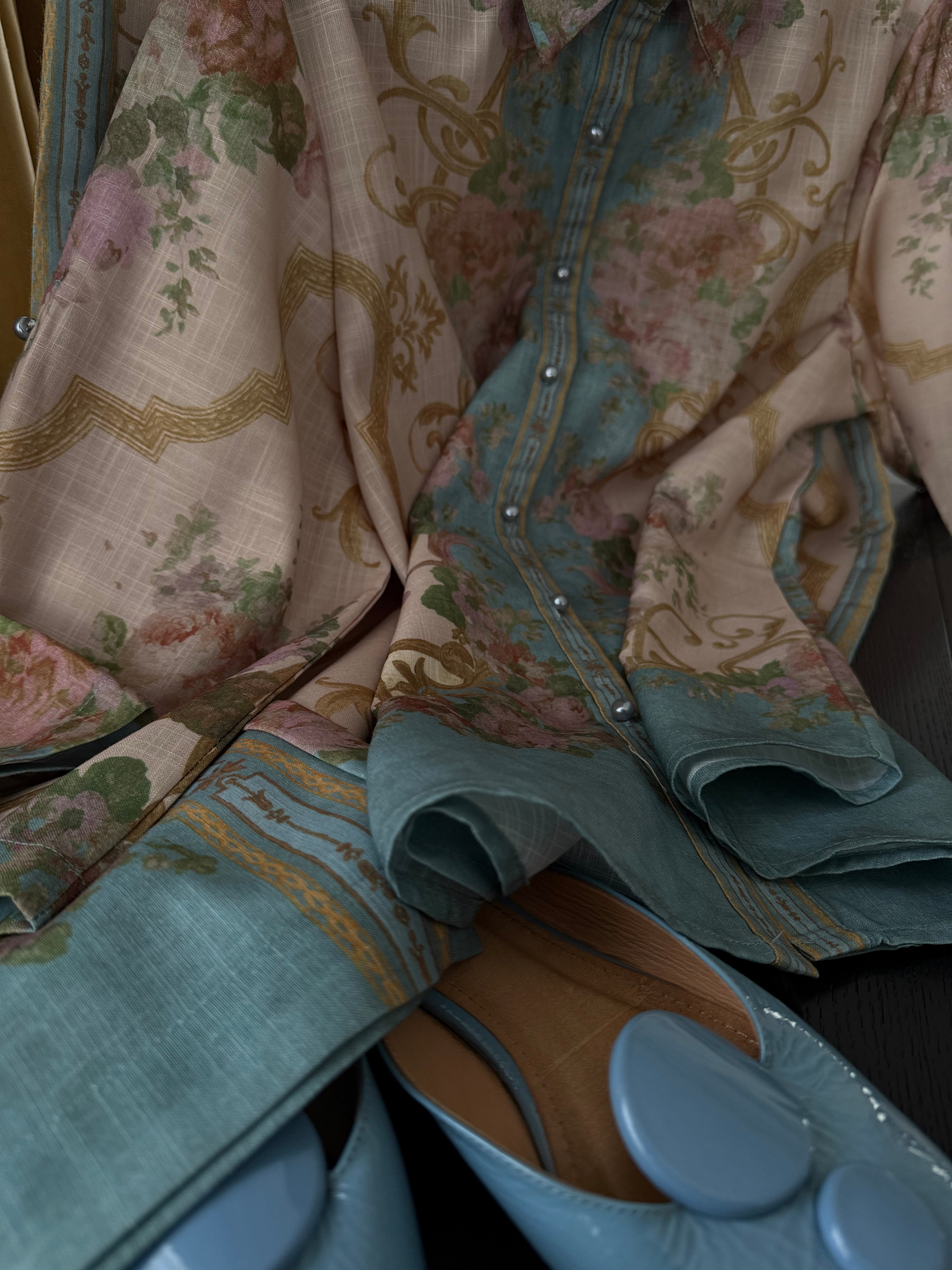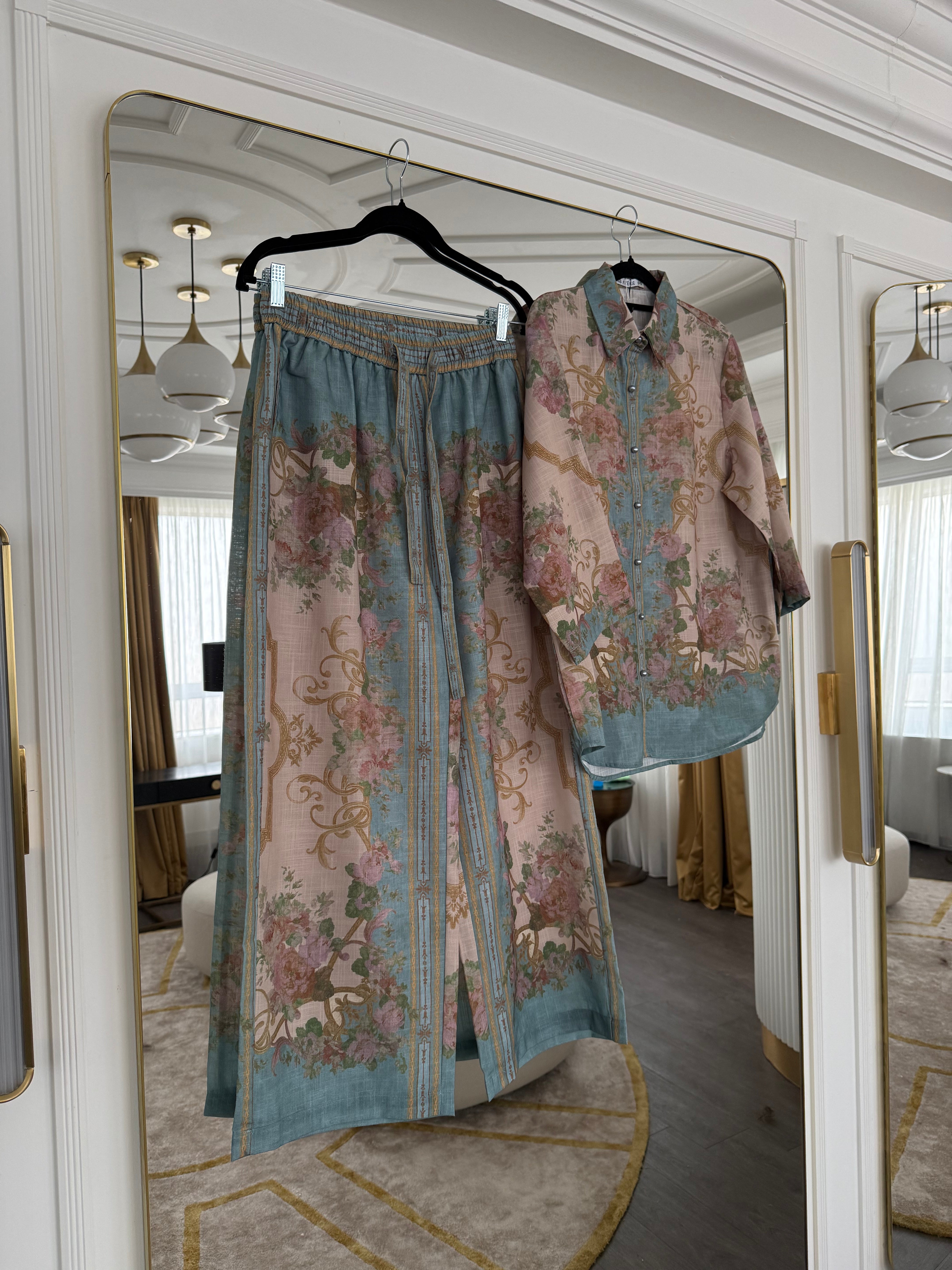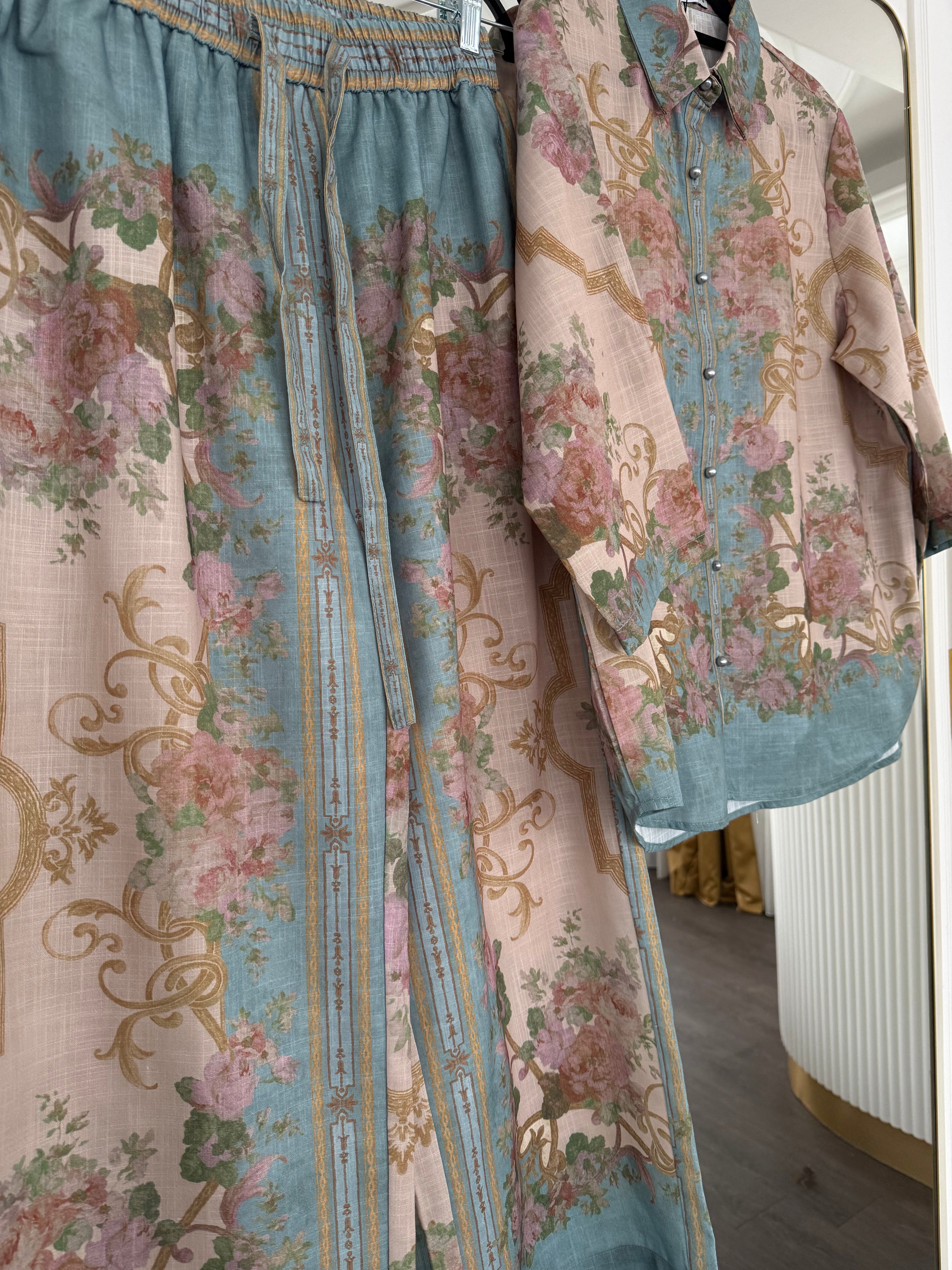 Step into a world of timeless romance with the Elysian Garden Coord. This luxurious two-piece set features a fluid, collared shirt and matching elastic-waist trousers, adorned in an intricate tapestry of vintage florals and baroque-inspired scrollwork.