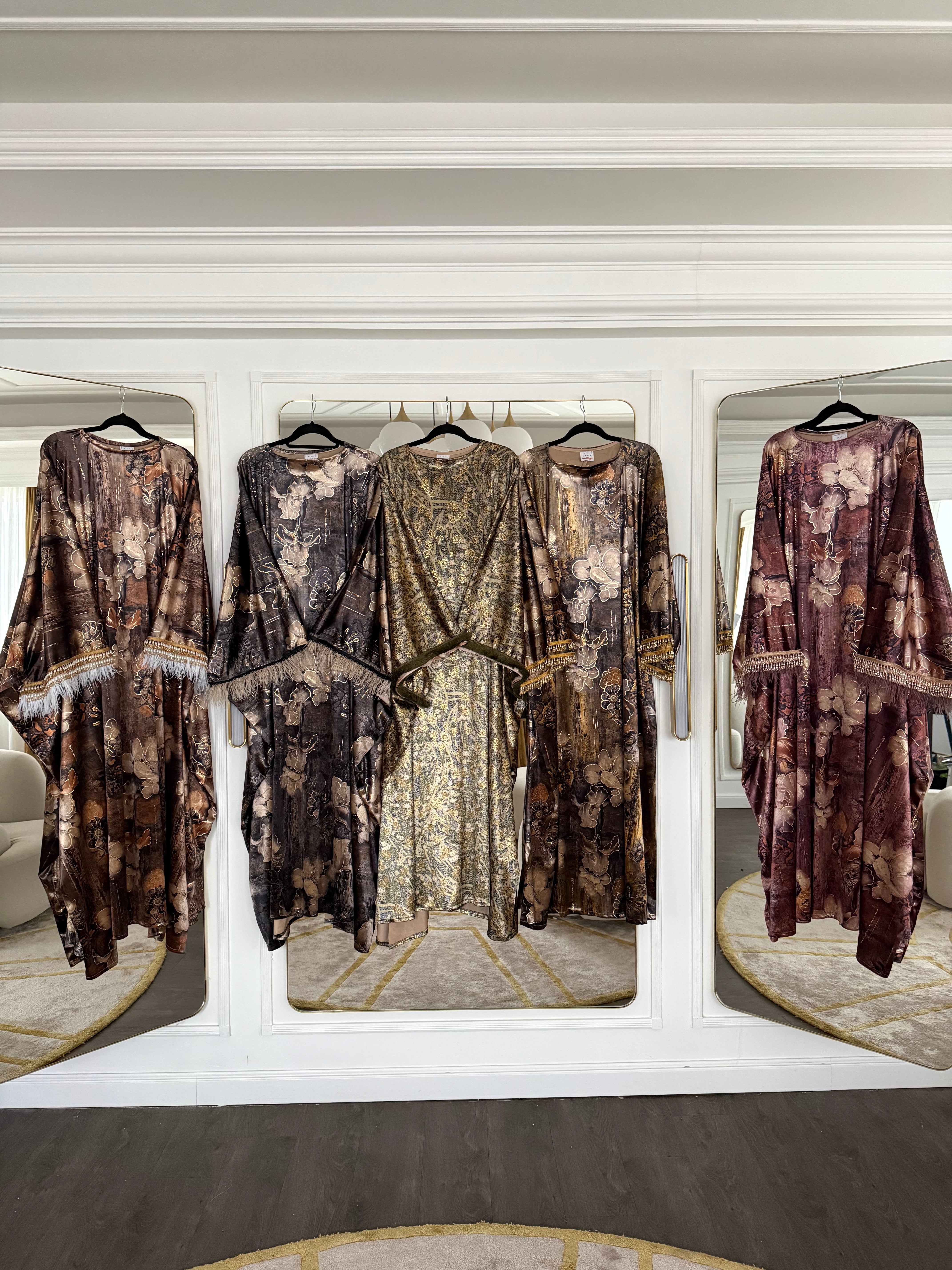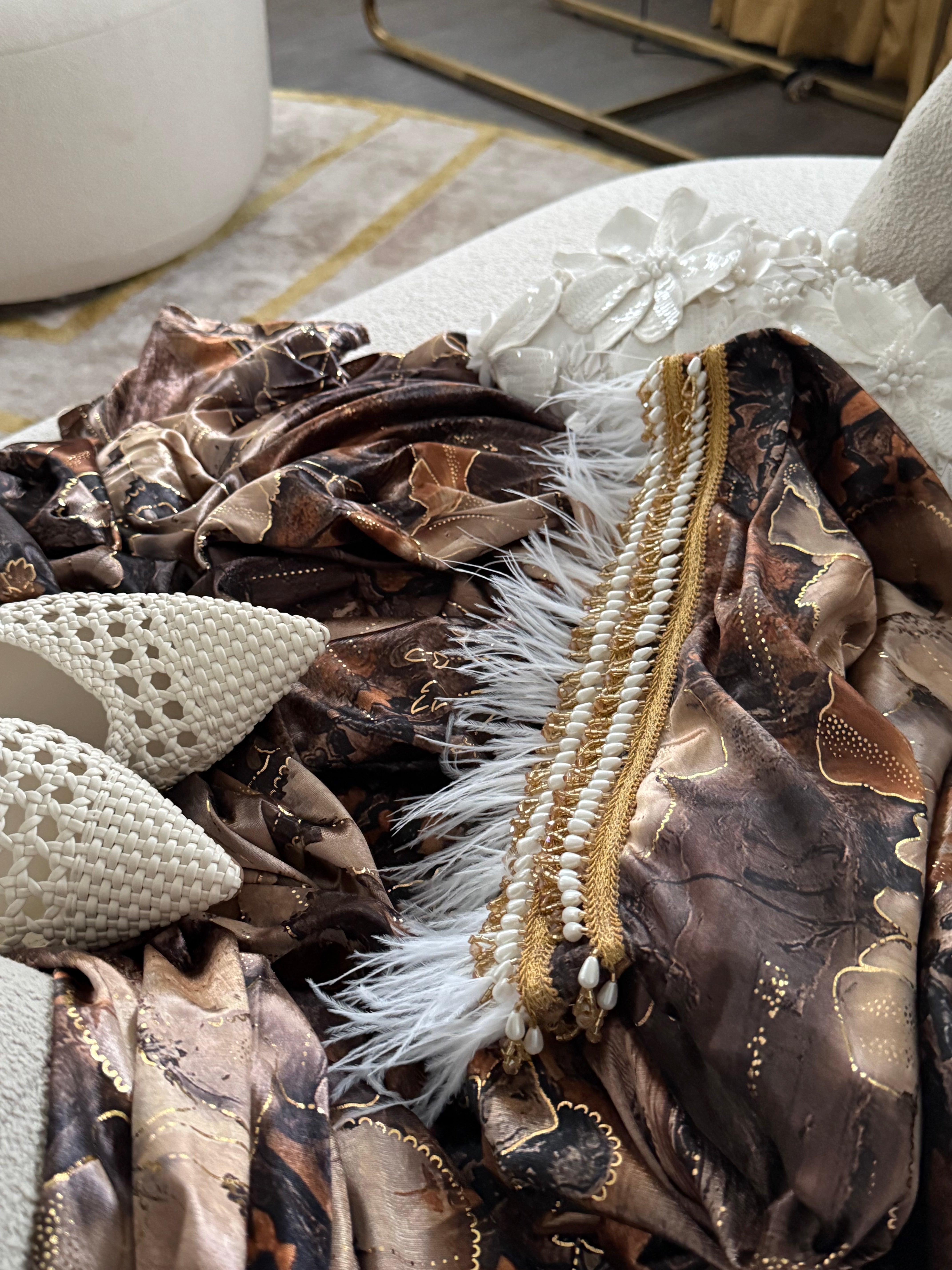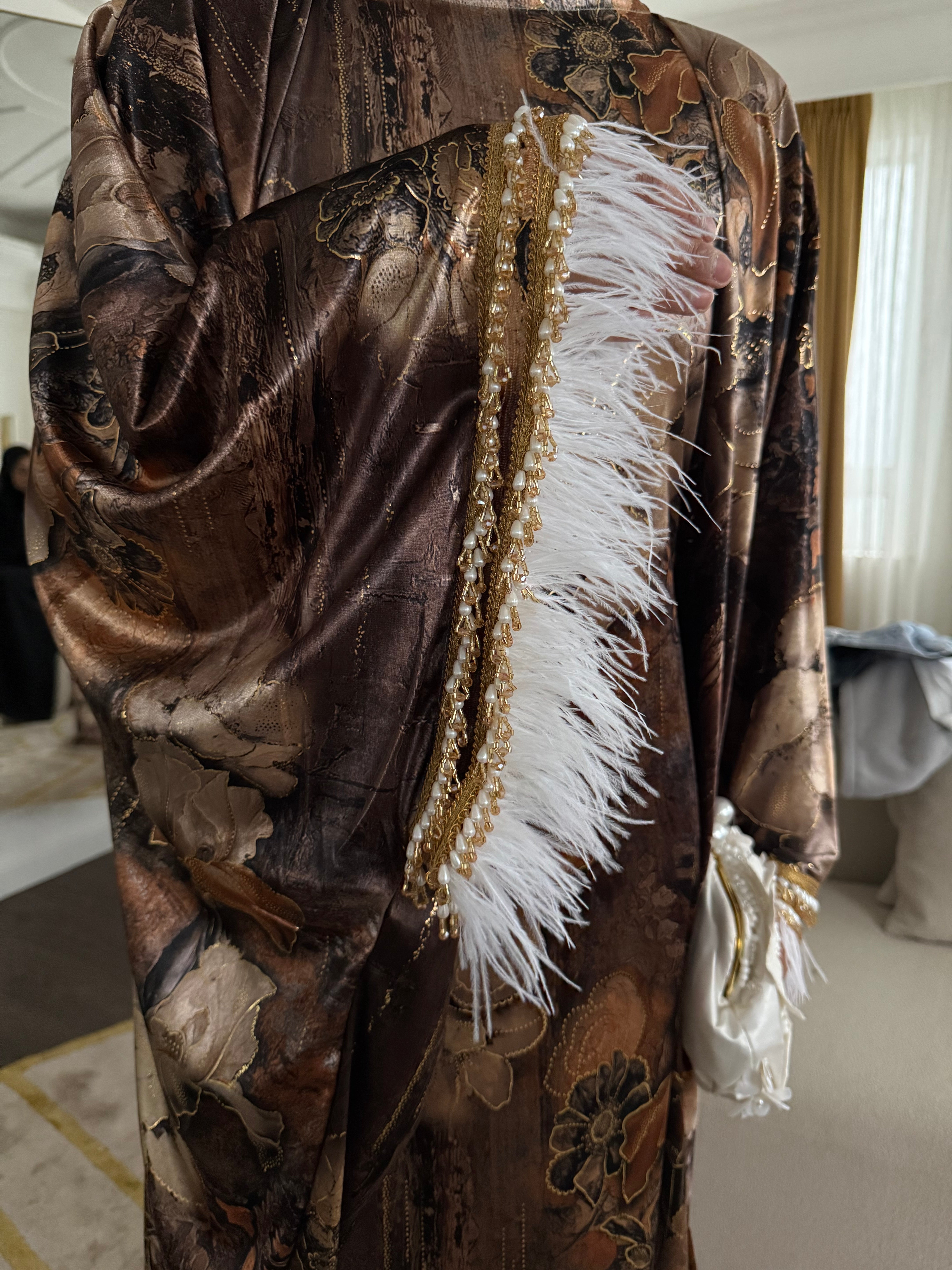 The Sultana Noir Feather Kaftan Mini offers a refined adaptation of the original design, maintaining its luxurious details. This mini version is ideal for coordinating outfits, making it an excellent choice for stylish mother-daughter ensembles. Its design balances elegance with functionality, ensuring comfort and style.