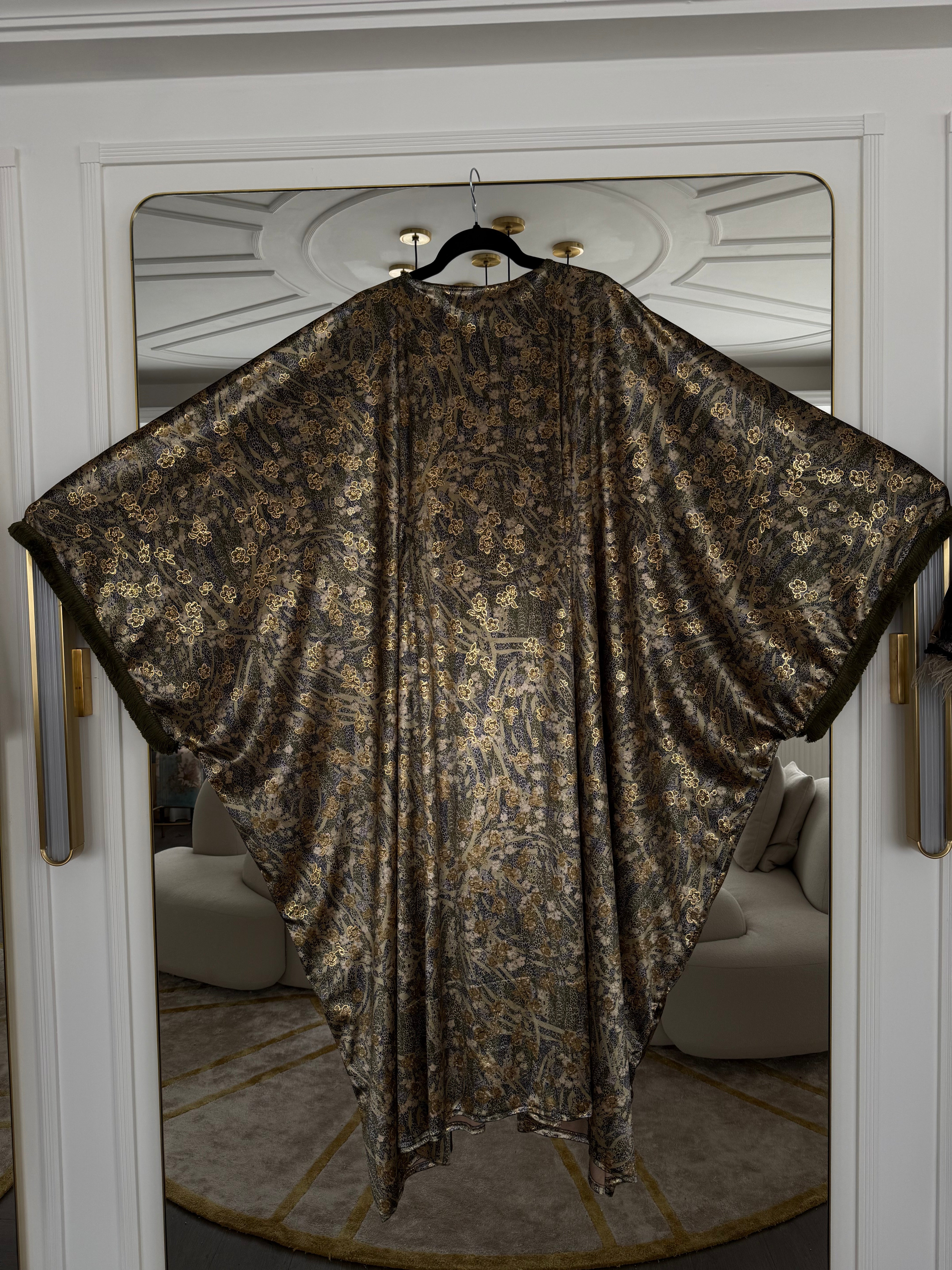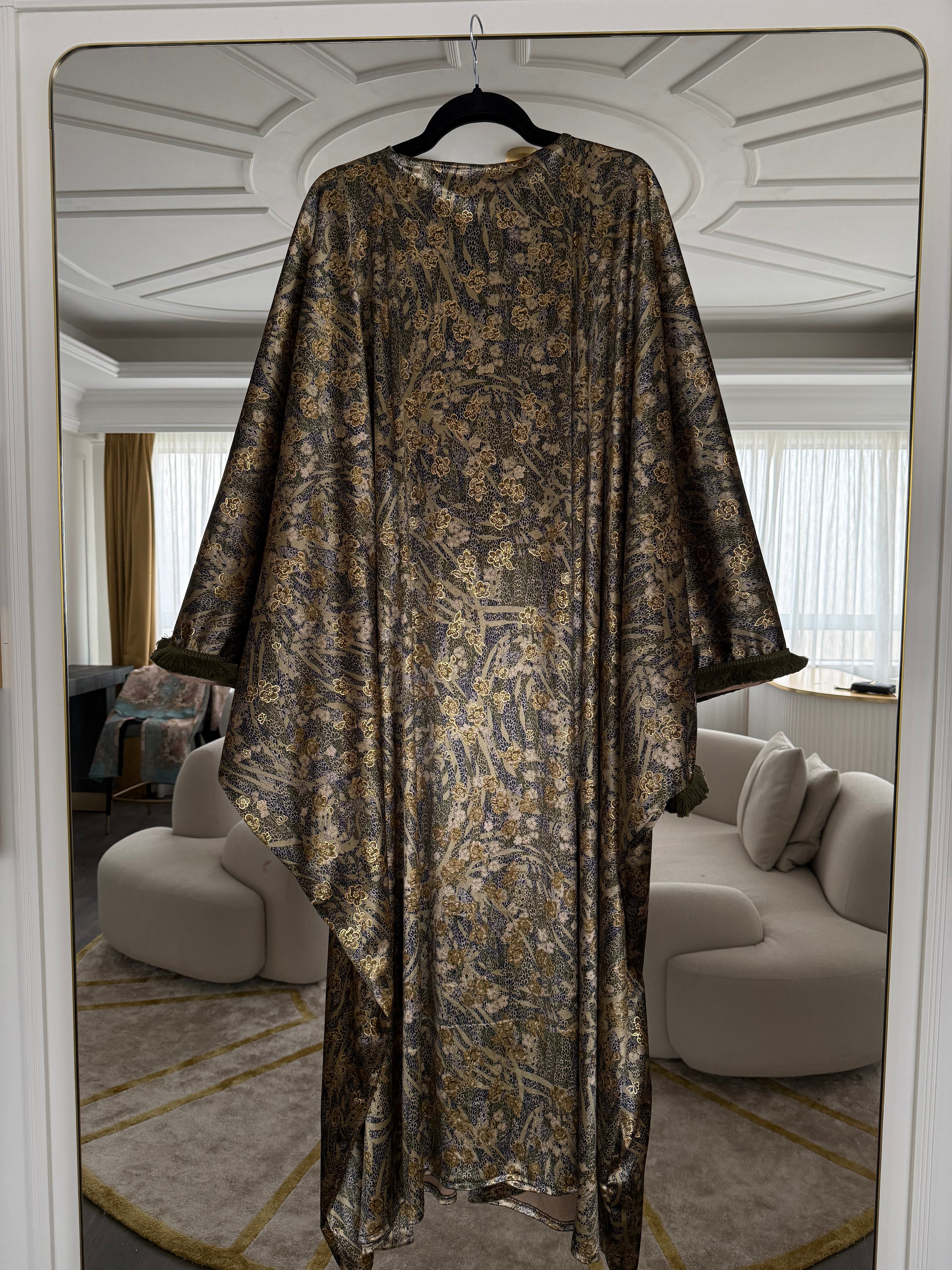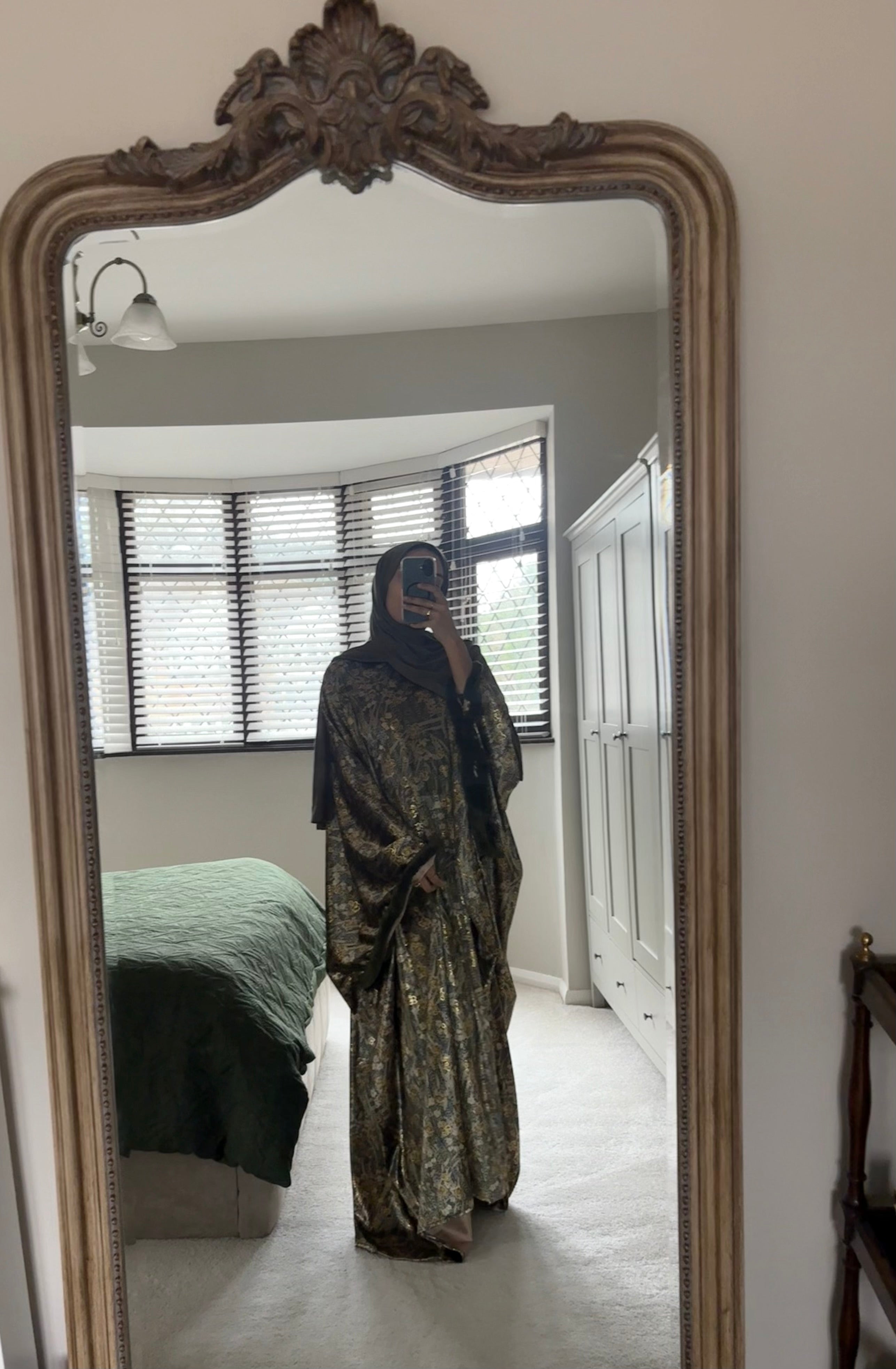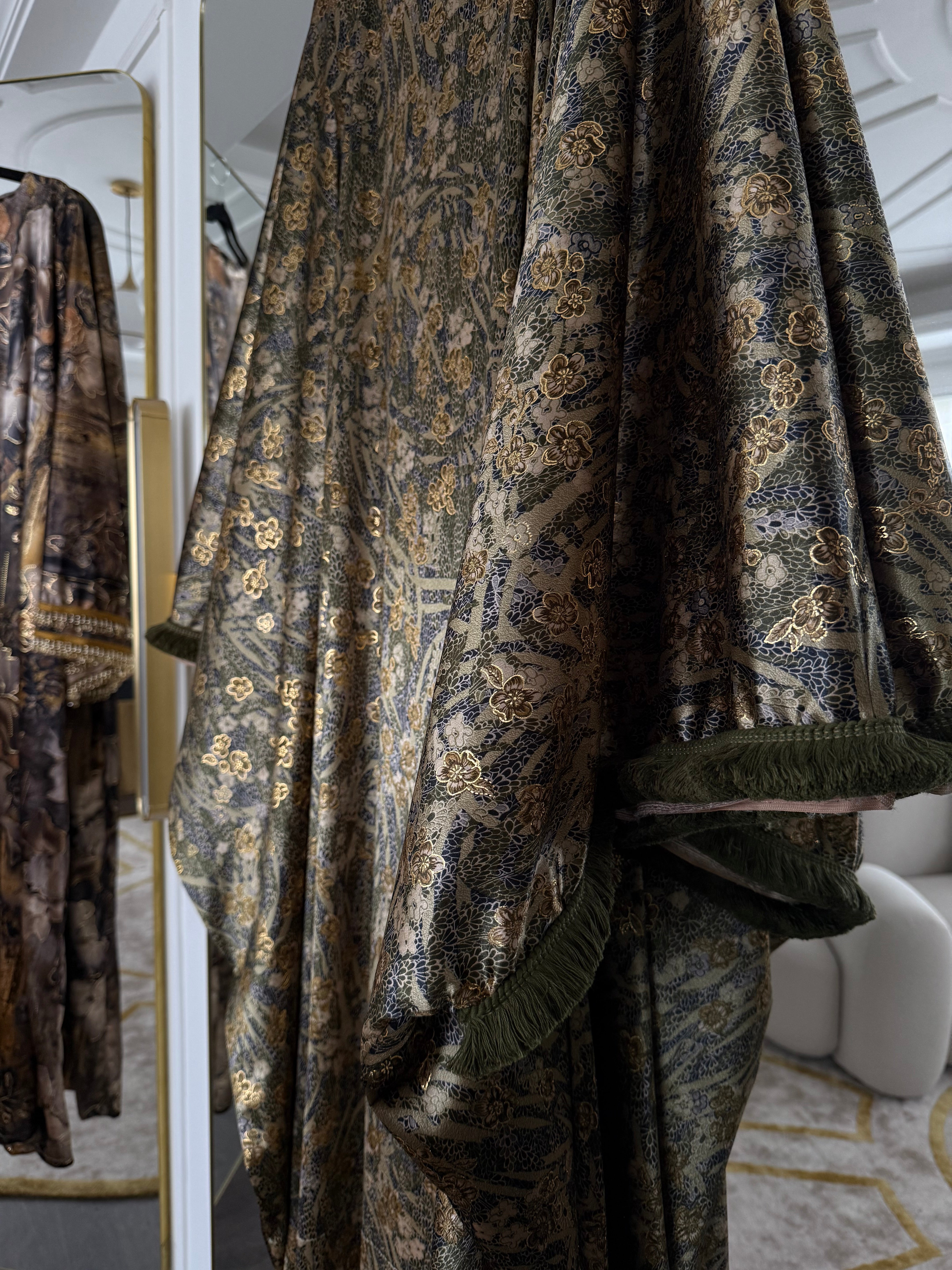 The Kings Garden Kaftan epitomises understated elegance with its rich olive base elevated by intricate gold detailing that whispers of heritage and refinement. Crafted with meticulous attention to traditional craftsmanship, this piece features luxurious cotton tassel trim adorning the cuffs—a signature touch that grounds opulence in authentic artistry. The integrated belt allows for personalised silhouetting, whilst the carefully curated length options ensure a flattering fit for every frame. Perfect for Ramadan evenings and Eid celebrations, this timeless kaftan bridges contemporary sophistication with deeply rooted cultural tradition, making it an essential addition to any discerning wardrobe.