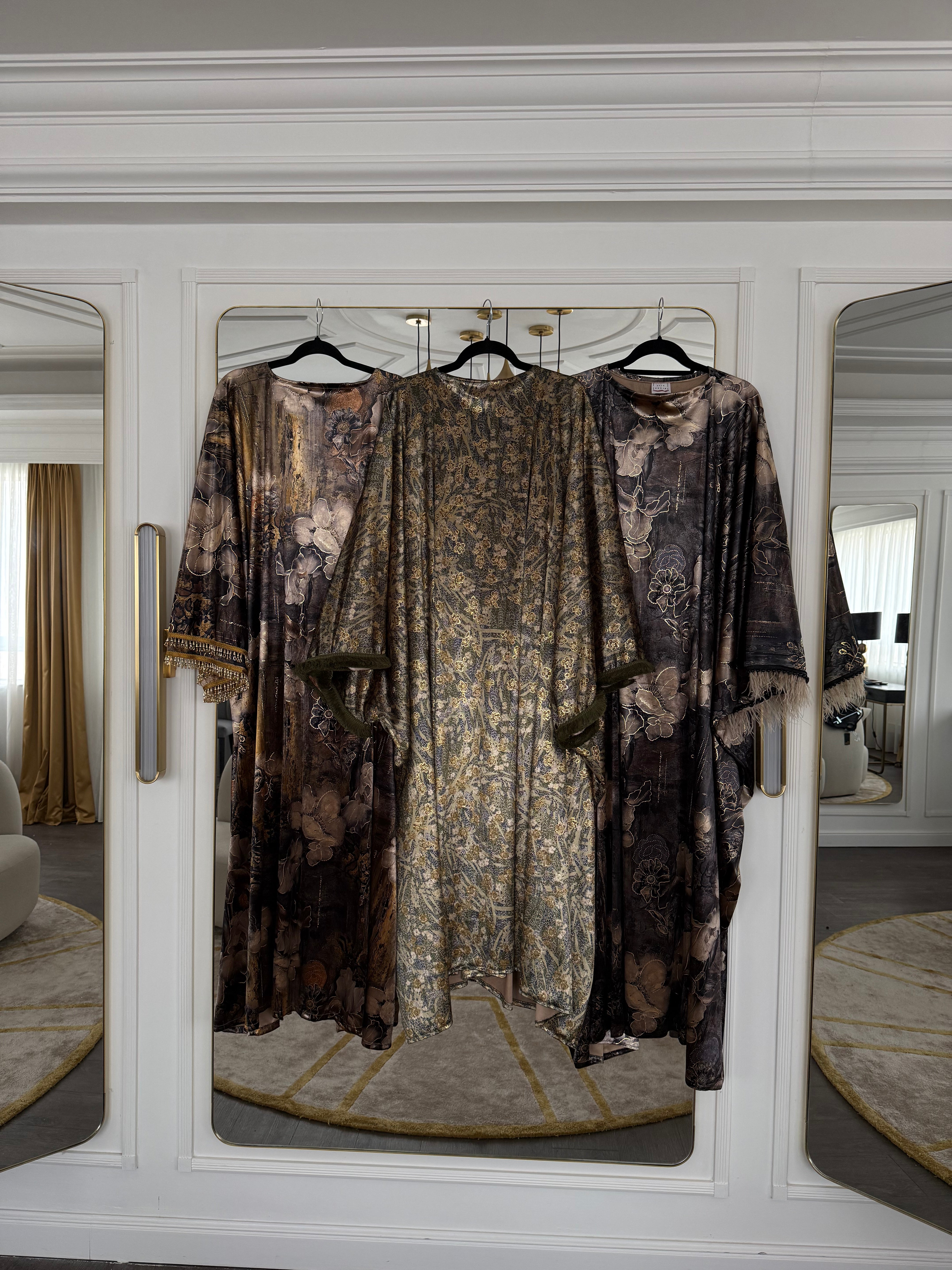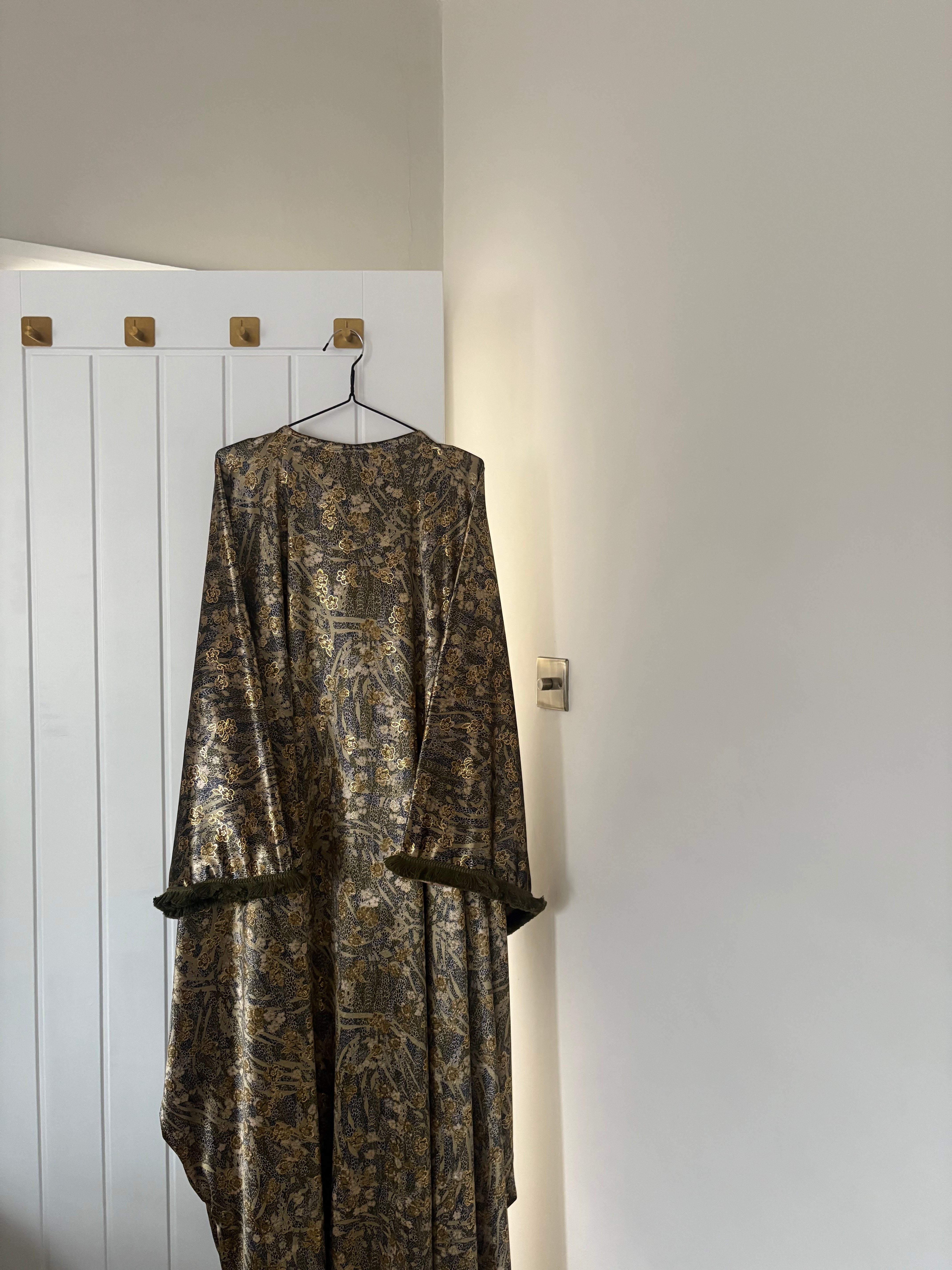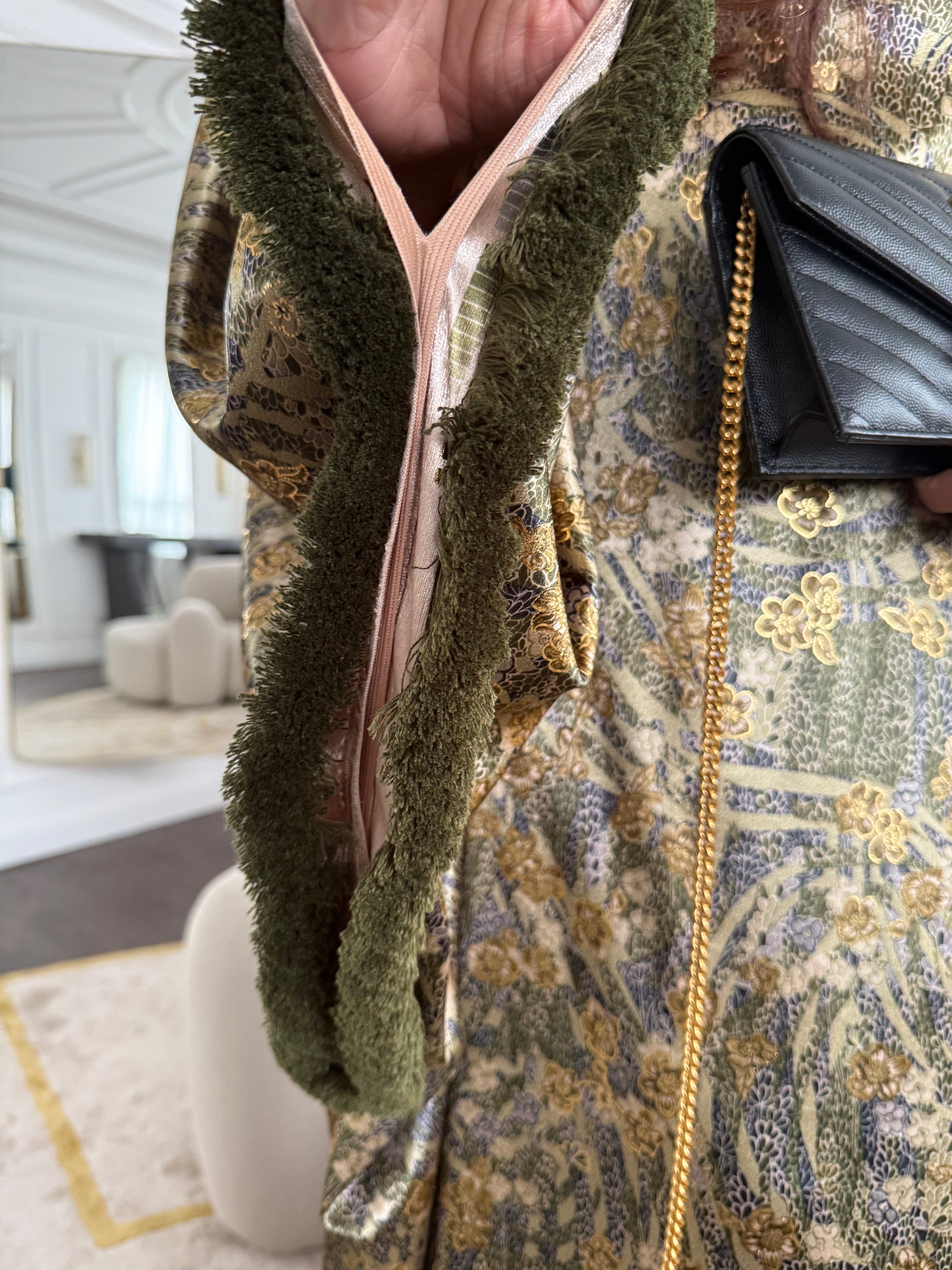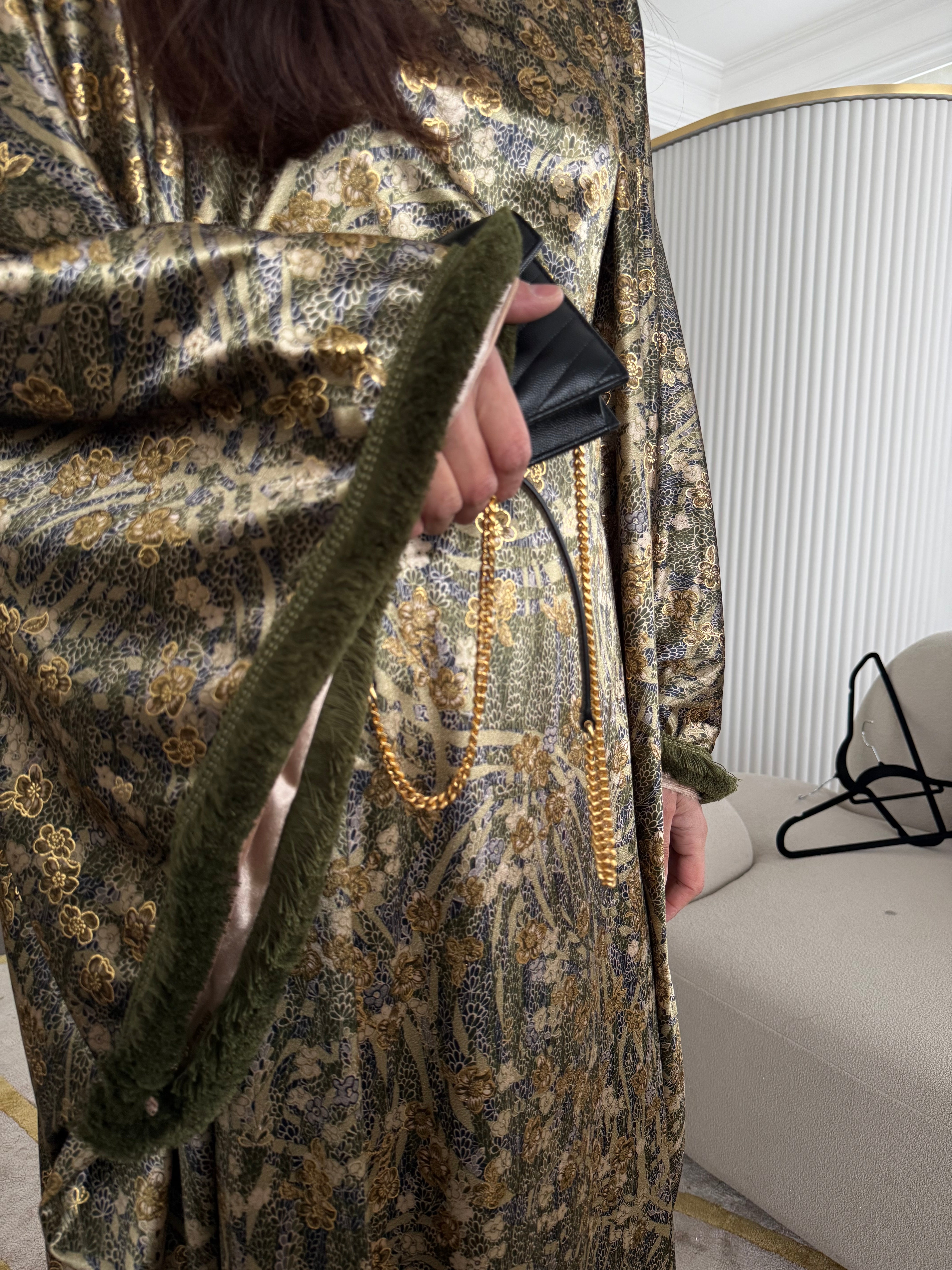 The Kings Garden Kaftan epitomises understated elegance with its rich olive base elevated by intricate gold detailing that whispers of heritage and refinement. Crafted with meticulous attention to traditional craftsmanship, this piece features luxurious cotton tassel trim adorning the cuffs—a signature touch that grounds opulence in authentic artistry. The integrated belt allows for personalised silhouetting, whilst the carefully curated length options ensure a flattering fit for every frame. Perfect for Ramadan evenings and Eid celebrations, this timeless kaftan bridges contemporary sophistication with deeply rooted cultural tradition, making it an essential addition to any discerning wardrobe.